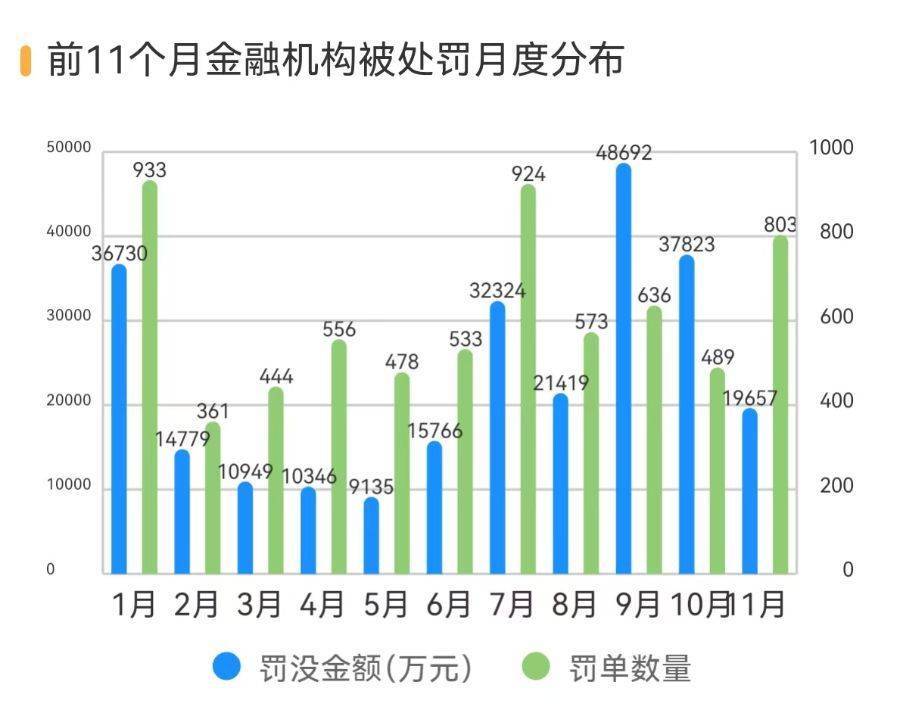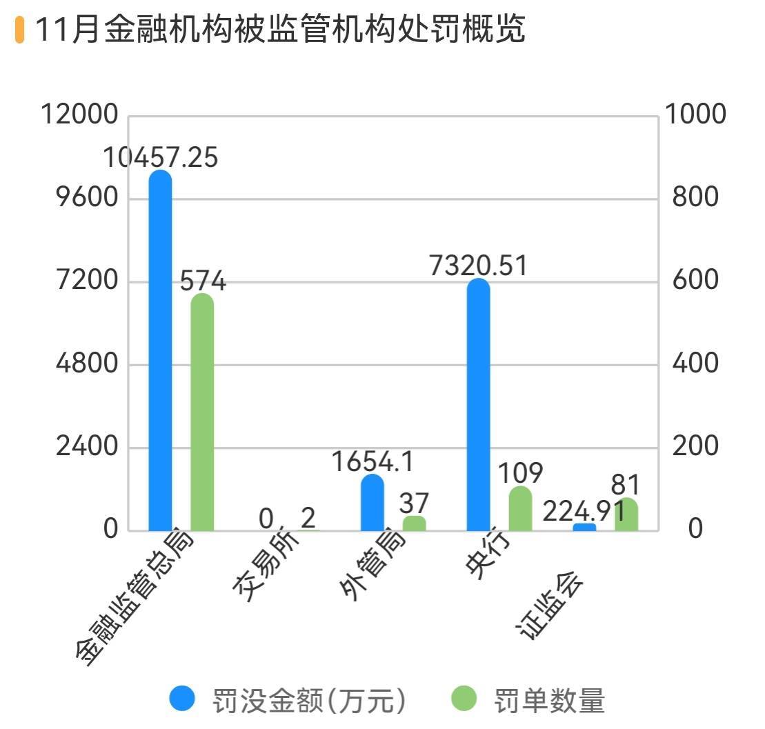 11月金融机构罚单明显增加,金融机构共收到803张罚单,同比增加42.38%,合计罚没金额19656.76万元,同比增加39.71%。