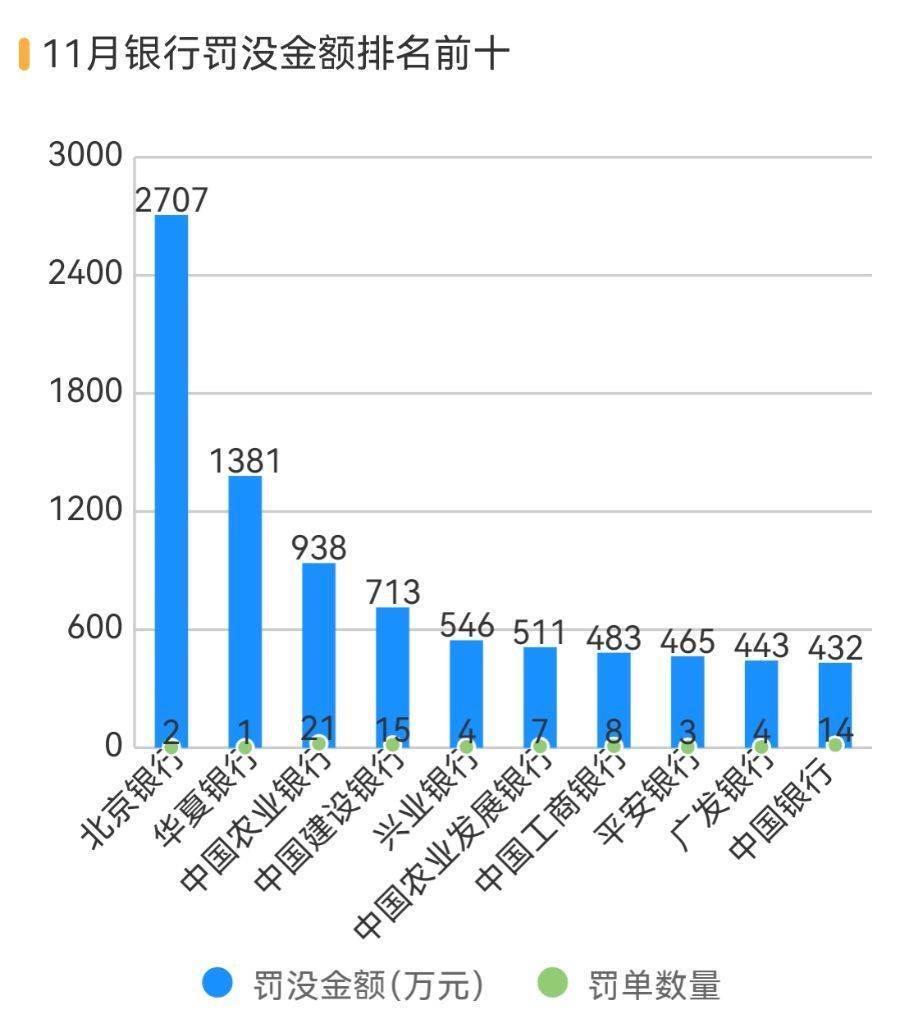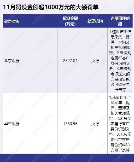 11月金融机构有两张罚单罚没金额超过1000万元,均为央行所开。其中北京银行因违反反洗钱法、违反信用信息采集/提供/查询及相关管理规定、违反收单业务管理规定、违反代收业务管理规定、占压财政存款或者资金、违反反假货币业务管理规定等被处罚,被央行警告,并没收违法所得1886.3元,罚款2526.85万元。北京银行零售银行部、电子银行部、运营管理部、信用卡中心、个人信贷部、法律合规部、公司银行部、交易银行部等部门11位相关人士也被处罚。