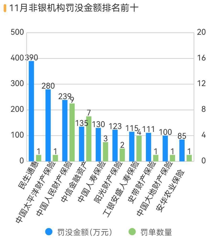 11月保险资管公司民生通惠资产管理的罚没金额在非银机构中最高,主要由于民生通惠资产管理收到一张罚没金额达390万元的罚单,主要违法违规行为为“未按照规定运用保险公司资金”。