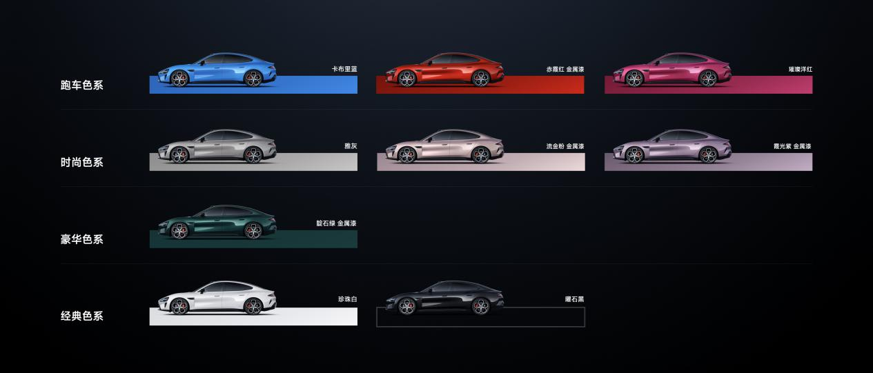 新一代SU7在传承第一代车型经典设计语言的基础上,对车漆、轮毂及功能细节进行了多项升级。新车提供总计9款车色,除保留备受好评的雅灰、珍珠白、璀璨洋红、霞光紫外,新增了灵感源自意大利“蓝洞”的“卡布里蓝”、热烈奔放的“赤霞红”以及深邃高级的“靛石绿”三款首发颜色。